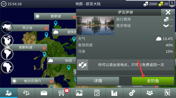 1、選擇薩瓦伊湖點擊去釣魚進入釣魚場景,熟悉地圖界面的功能和不同釣點的信息開啟釣魚冒險。