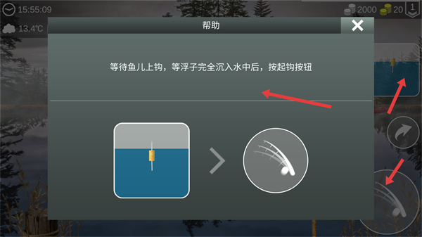 3、閱讀幫助說明了解釣魚的操作方法等待浮子完全沉入水中后,按起鉤按鈕掌握釣魚的關鍵時機提升釣魚效率。
