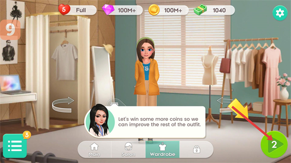 2、在衣櫥界面,點擊綠色箭頭按鈕繼續游戲,贏取更多金幣來提升角色的整體裝扮,打造不同風格造型。