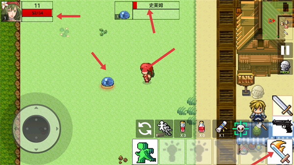 4、在場景中移動角色攻擊史萊姆留意角色生命值,合理使用武器和道具提升戰斗技巧推進游戲進程。
