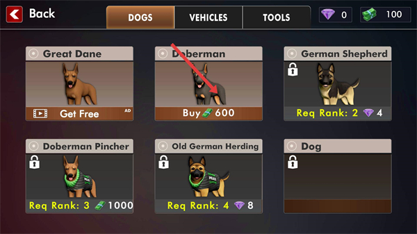 3、進入狗狗界面,選擇Doberman并花費600資源購買,解鎖該警用犬助力執法任務。
