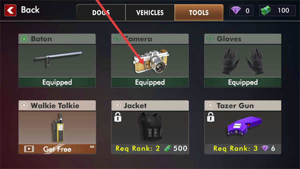 4、切換到工具界面,確認Camera等工具處于裝備狀態,確保執法過程中工具可正常使用。