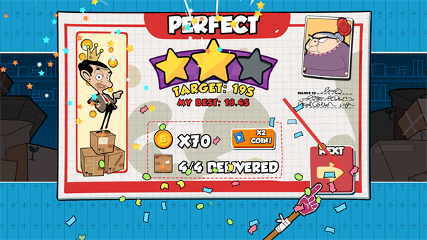 4、完成配送后,點擊NEXT按鈕,查看4DELIVERED的任務完成情況,領取獎勵并進入下一關。