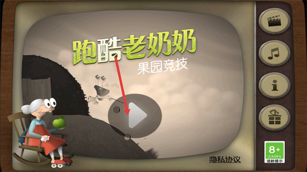 1、點擊播放按鈕,進入跑酷老奶奶果園競技模式,開始游戲挑戰,追上小偷。