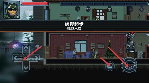 3、在緩慢起步關卡中使用方向鍵移動角色,結合射擊和互動按鈕,執行拯救人質的任務。