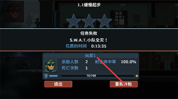 4、任務失敗后,點擊重新開始按鈕,再次挑戰1緩慢起步關卡,積累經驗提升任務完成率。