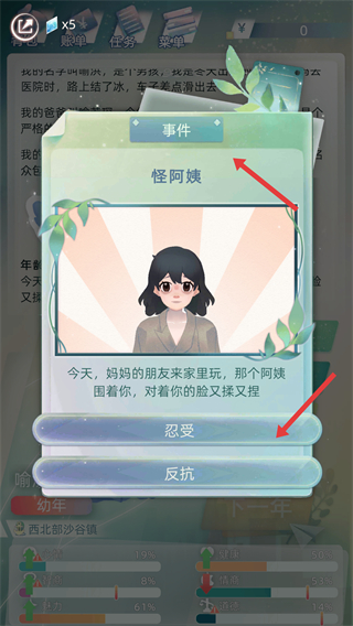 2、面對怪阿姨事件選擇忍受或反抗不同選擇將影響角色屬性,需根據游戲策略做出決擇推進劇情發展。