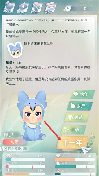 3、點擊下一年推進角色年齡增長解鎖新的人生階段和事件,提升對游戲進程的掌控豐富角色人生經歷。