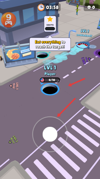 1、操控黑洞移動吞噬目標熟悉游戲的吞噬操作,開啟黑洞吞噬的冒險努力達到目標分數。