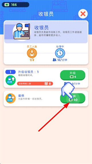 4、雇傭收銀員,點擊雇傭按鈕為超市新增收銀員,提升收銀效率,助力超市的經營發展。