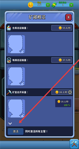 2、進入礦藏概覽頁點擊激活按鈕可同時激活所有主管,提升倉庫電梯礦層的總運輸量與開采量加速資源獲取。