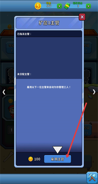 3、打開礦層1主管界面花費100金幣雇用主管,主管可協助管理工人提升礦層開采效率推進游戲進程。