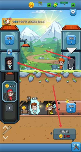 4、回到主界面點擊建筑上的等級按鈕可升級建筑,安排工人到礦層作業,積累資源后點新礦層按鈕消耗2千8金幣開啟新礦層。
