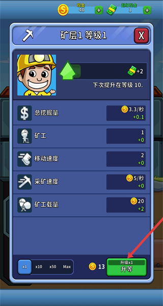 1、在礦層升級界面點擊花費13現金購買的按鈕,消耗金幣提升礦層屬性可增加挖掘量礦工數量等強化開采能力。