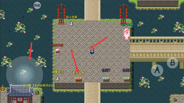 2、進入游戲場景后操控角色移動前往新手寶箱處場景中還有戰斗加速、治療水晶、倉庫等功能區域。