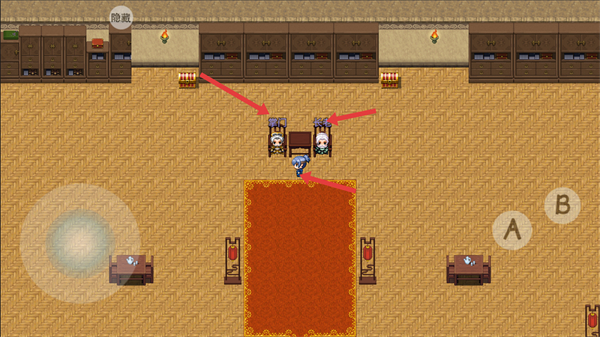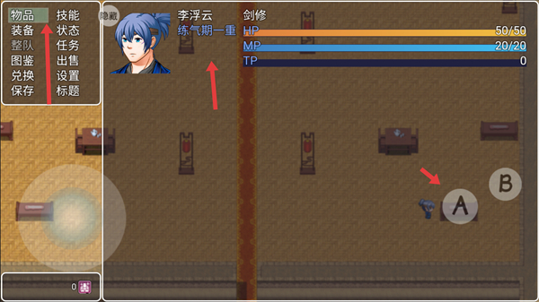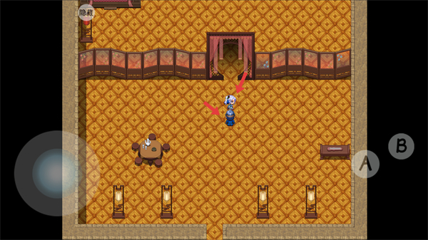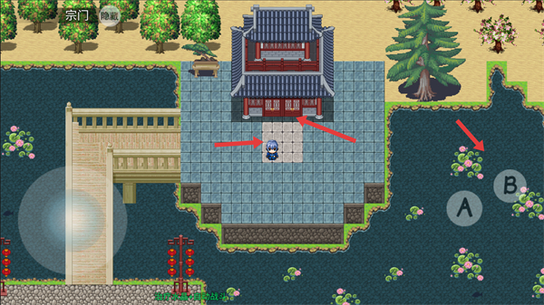 1、在宗門場景中操控角色移動前往建筑內探索,注意右側的A、B操作按鈕合理操控角色行動。