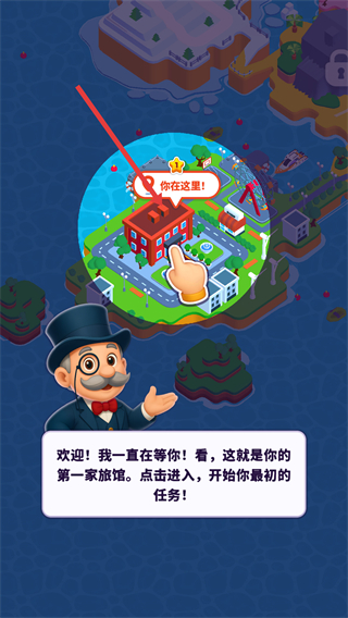 1、點擊標注你在這里的紅色旅館建筑,進入第一家旅館,開啟旅館經營的初始任務,熟悉游戲核心玩法。
