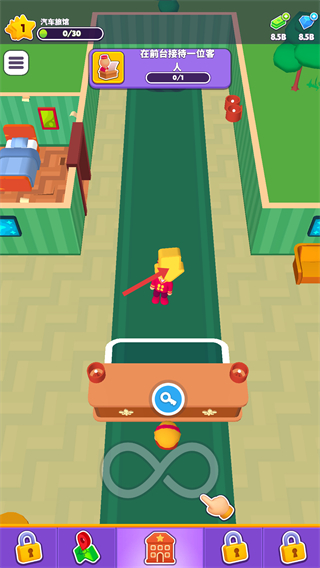 2、在旅館前臺區域,完成在前臺接待一位客人的任務,點擊前臺人員,推進旅館服務流程,獲取經營收益。