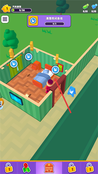 3、進入客房區域,執行清理房間各處的任務,點擊房間內帶有清潔圖標的位置,完成客房清潔,提升客房品質。