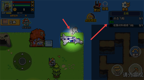 1、按照主線任務指引點擊飛船推進收集材料維修飛船的任務,同時積累經驗和金幣提升角色等級以增強生存能力。