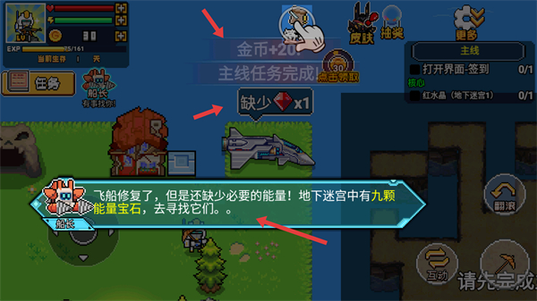 2、完成點擊飛船任務后會獲得金幣獎勵,此時需前往地下迷宮尋找紅水晶以滿足飛船能量需求推進主線任務進程。