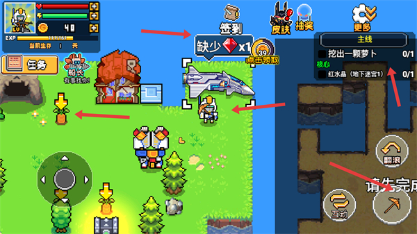 3、根據主線任務挖出一顆蘿卜使用鎬子工具開采,同時留意簽到獎勵積累資源以助力后續地下迷宮探索和任務完成。