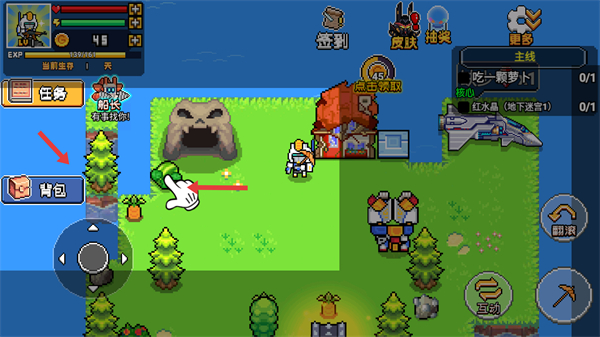 4、點擊背包查看資源然后食用蘿卜補充狀態,為進入地下迷宮尋找紅水晶做準備持續推進主線任務完成荒島生存挑戰。