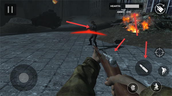 3、戰斗中持續瞄準并射擊敵人合理利用彈藥同時留意周圍環境中的爆炸物和掩體,確保自身安全逐步消滅敵人推進戰役。