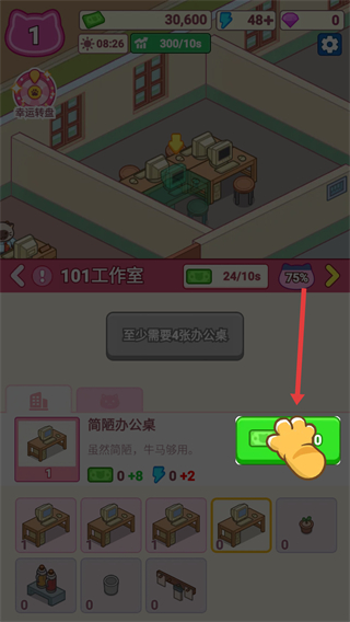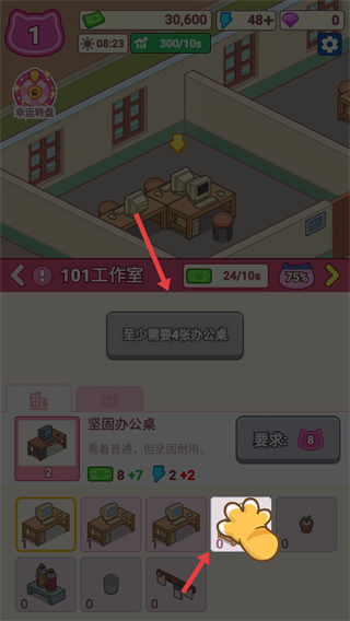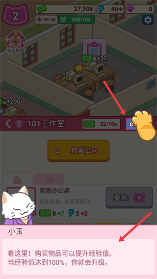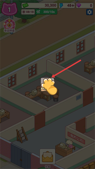 1、游戲中跟隨貓爪指引點擊建筑區域可開啟新的功能區域,這是拓展公司規模的第一步能為后續發展奠定基礎。