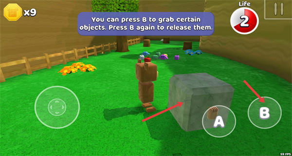 2、遇到可抓取物體如石塊按B鍵抓取抓持中再次按B可釋放,利用此操作搬運物品推開道路障礙或觸發機關。