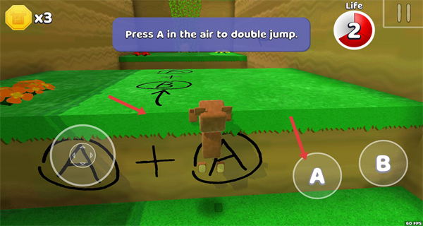 1、游戲中觸發二段跳教學要空中按A鍵即可執行,先跳躍騰空再迅速點A讓小熊實現二段跳跨越較寬較高障礙。