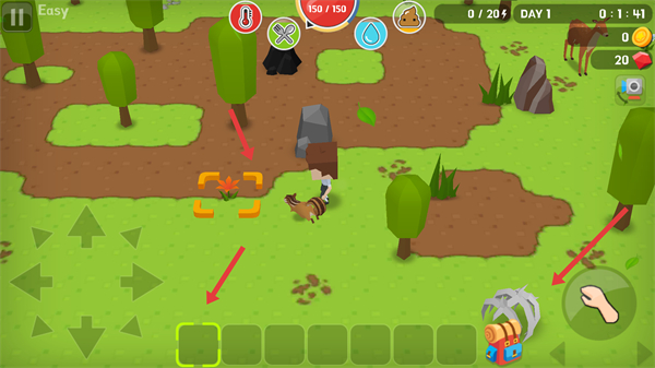 2、操控角色移動靠近花朵等資源時,點擊右下角手形按鈕進行互動收集資源用于后續制作工具或生存。