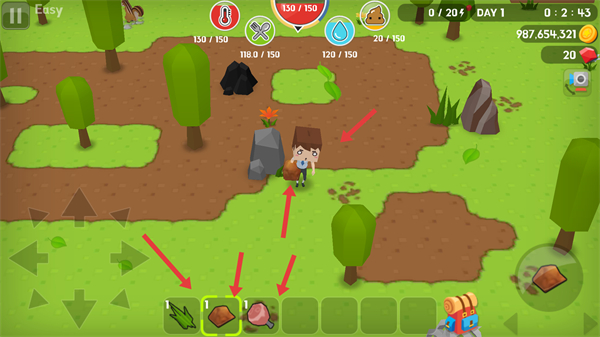4、收集資源時注意角色的各項生存指標,同時合理利用收集到的資源如石頭、植物等助力在這個世界中生存發展。