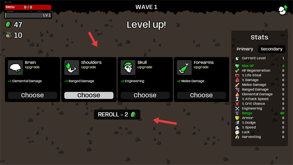 3、升級時會出現四個升級選項可根據需求選擇,若不滿意可用金幣重roll選擇合適的屬性提升來增強角色能力。