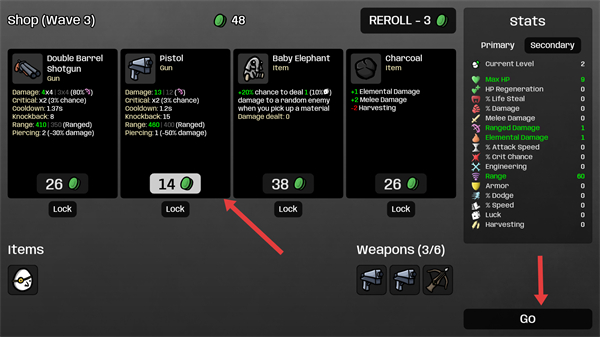 4、在商店界面可花費金幣購買武器、物品,根據資源和需求選擇合適的裝備購買后點擊GO繼續戰斗提升戰斗效率。
