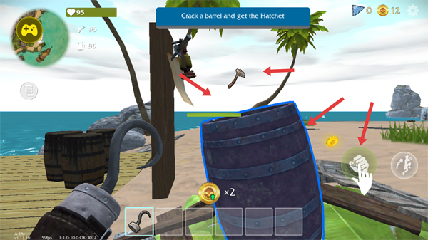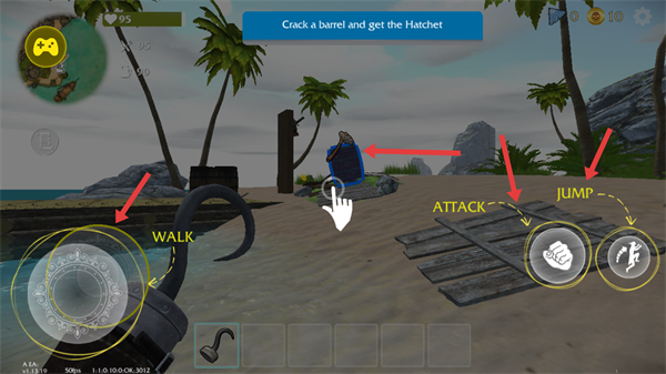1、游戲開始需熟悉操作左側搖桿控制移動右側攻擊、跳躍按鈕執行動作,按任務指引找到木桶準備打破它獲取斧頭。