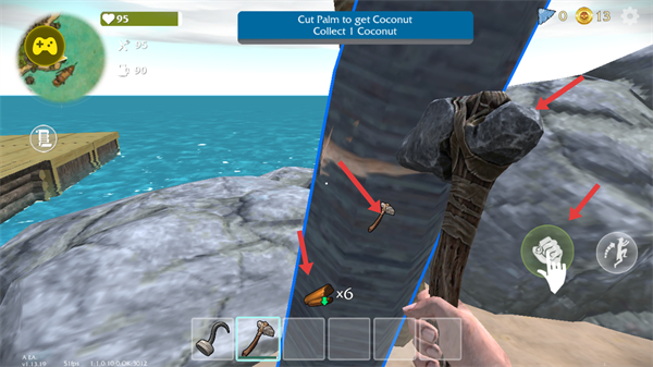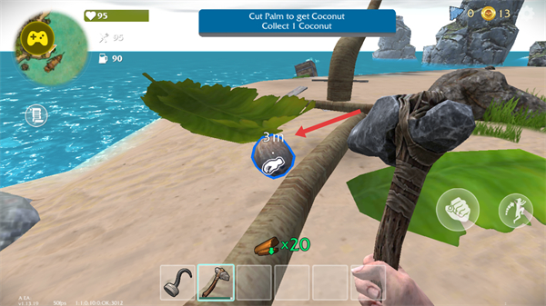4、砍伐棕櫚樹后會掉落椰子靠近椰子并收集它,完成收集1個椰子的任務同時繼續探索獲取更多資源。
