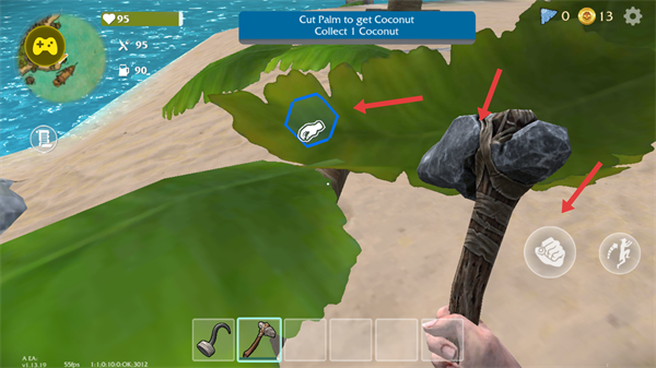 1、完成砍伐棕櫚樹后看到帶有手型圖標的椰子需靠近并收集它,這是完成收集椰子任務的關鍵步驟。