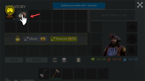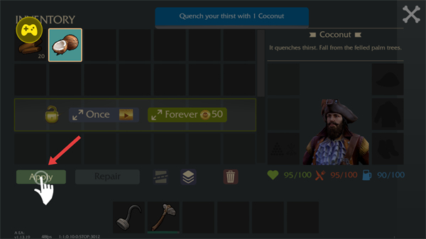 4、選中椰子后點擊Apply按鈕使用椰子以此來解渴,完成用1個椰子解渴的任務維持角色的生存狀態。