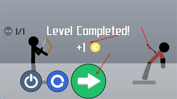 4、通關后獲金幣獎勵,點綠色箭頭進下一關,可重玩或退出,積累金幣解鎖更強武器。