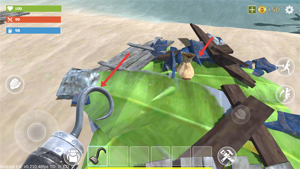 1、在沙灘場景中留意帶有麻袋的資源點靠近后可收集材料,這些材料是后續修復建筑、制作道具的基礎需優先收集。