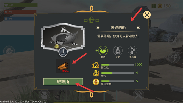 2、面對破碎的船需收集250根木材來修復修復后可作為躲避敵人的避難所,還能解鎖復活、火爐、凈水器等功能提升生存能力。