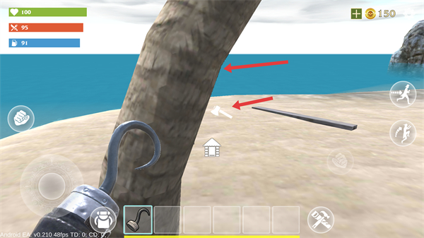 4、獲得石斧后前往棕櫚樹處用石斧砍伐樹木可獲取木材和椰子,木材用于修復建筑椰子用于解渴保障角色的生存和發展。