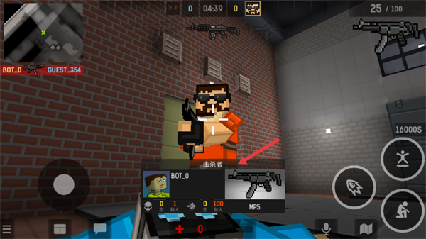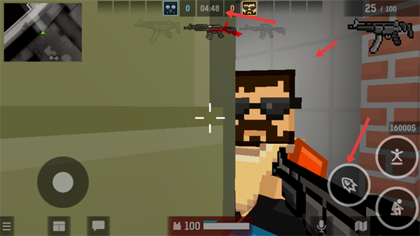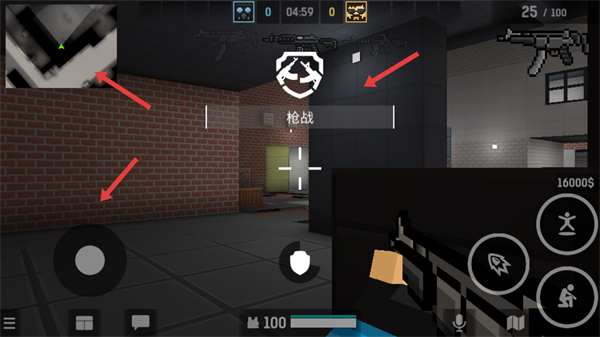 2、在槍戰模式中利用左下角搖桿控制移動,右上角小地圖觀察敵人位置借助墻壁等掩體躲避敵人攻擊尋找進攻時機。