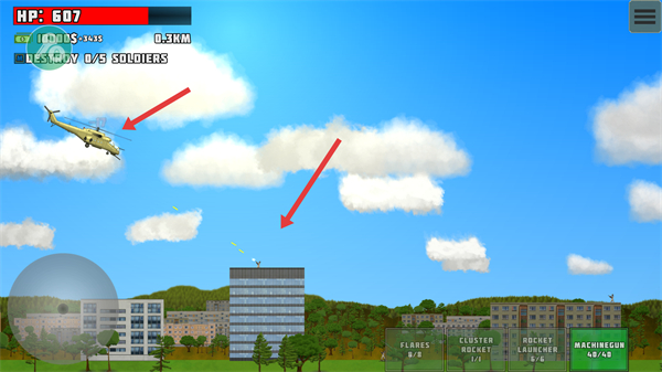2、在游戲中使用左下角搖桿控制直升機移動,根據任務摧毀5名士兵的指引在城市上空尋找士兵位置準備發起攻擊。