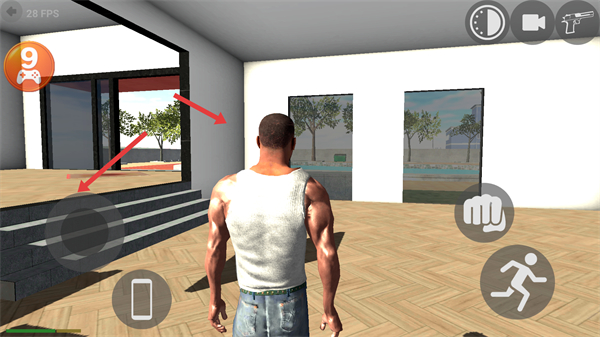 2、在室內場景中利用左側搖桿控制角色移動右側的拳頭、跑步按鈕可執行攻擊和移動操作探索場景尋找任務目標。