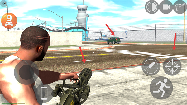 2、獲取槍支后瞄準目標進行射擊,利用右側的火箭彈和瞄準按鈕輔助攻擊注意調整射擊角度提高命中效率。
