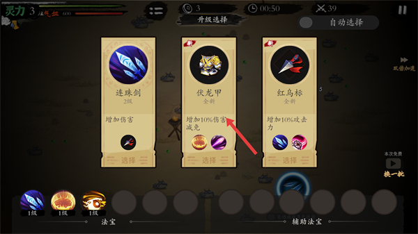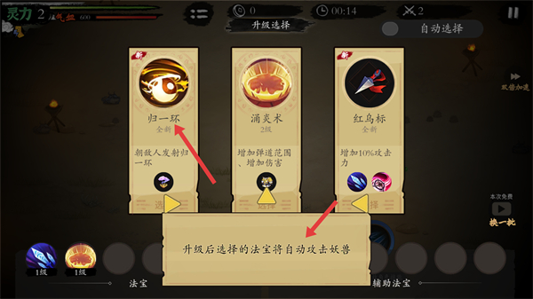 1、升級時會出現法寶選擇界面選擇合適的法寶如歸一環,升級后可自動攻擊妖獸提升戰斗效率助力關卡挑戰。