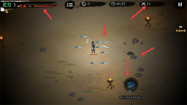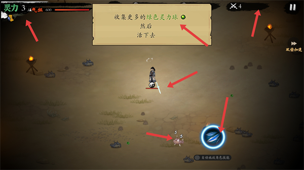 3、戰斗中利用法寶技能攻擊妖獸同時收集靈力球保持氣血穩定,不斷提升殺敵數增強角色戰斗能力推進關卡進度。