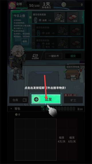 2、點擊出發按鈕,外出搜尋物資,這是獲取資源、完成任務的關鍵步驟,需合理規劃外出時間與路線。